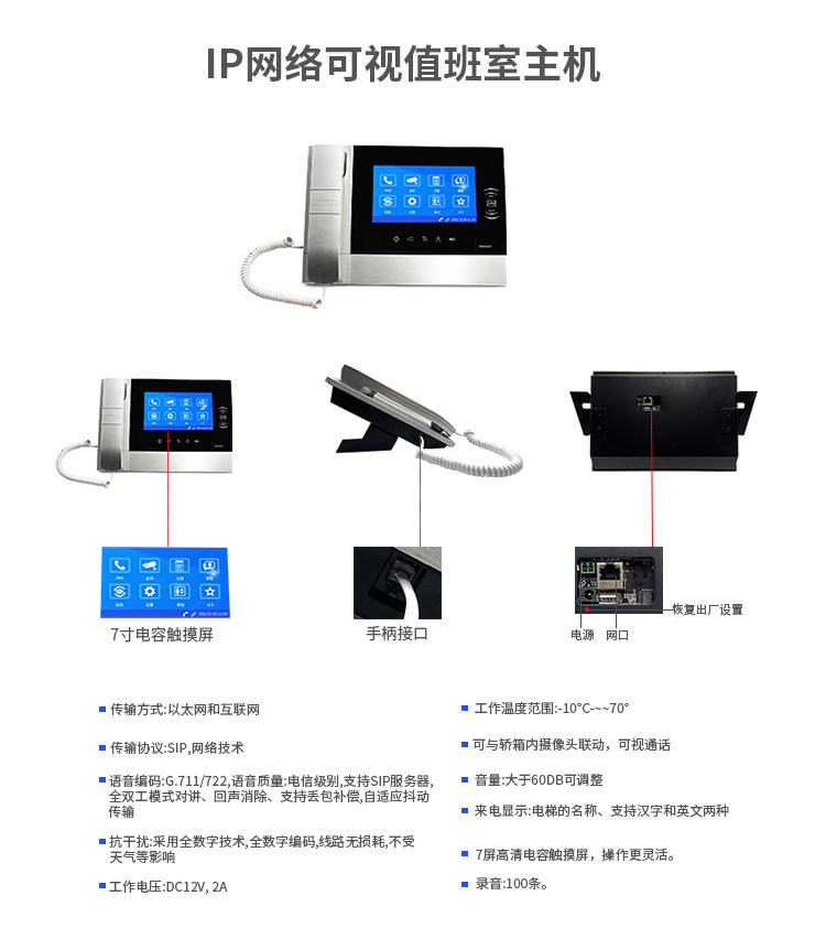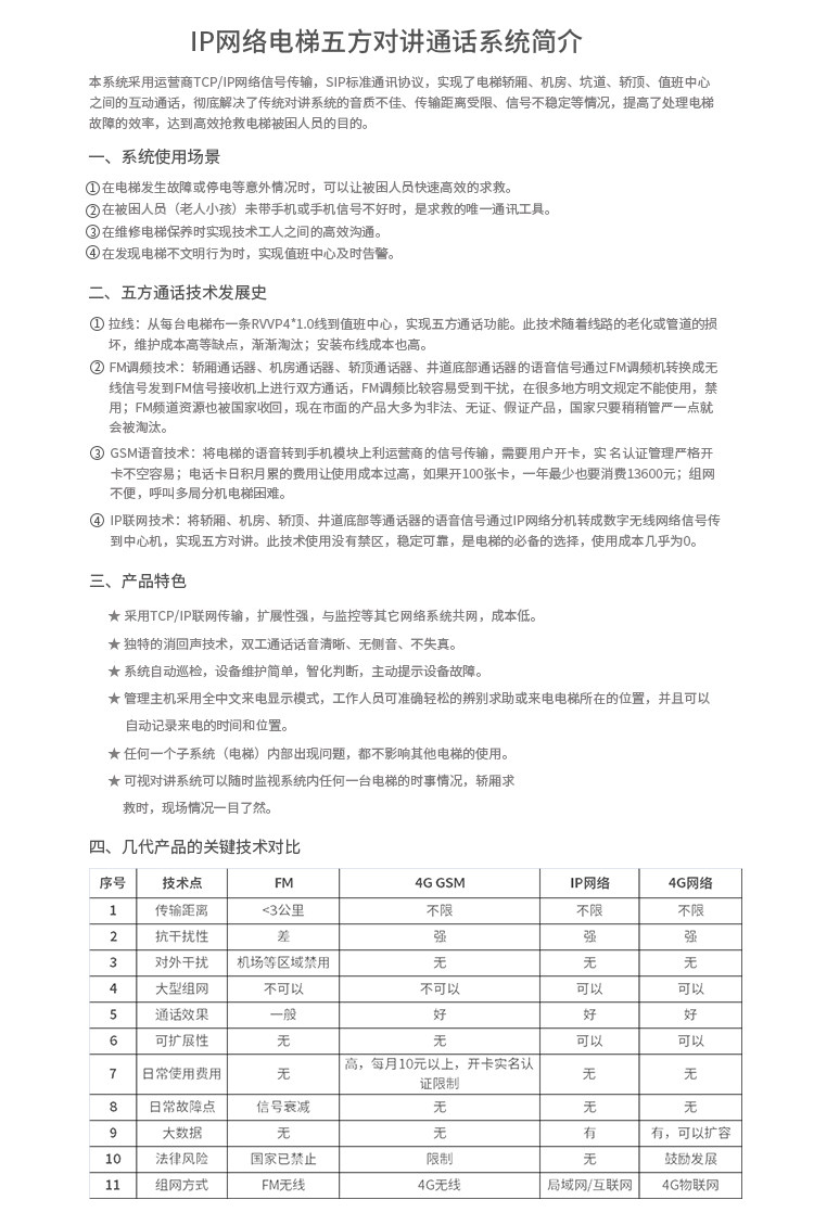 采用IP联网技术,共用项目智能化网络,成本低,兼容目前市场所在日立电梯的原有4方标准话机,安装简单通话效果好。